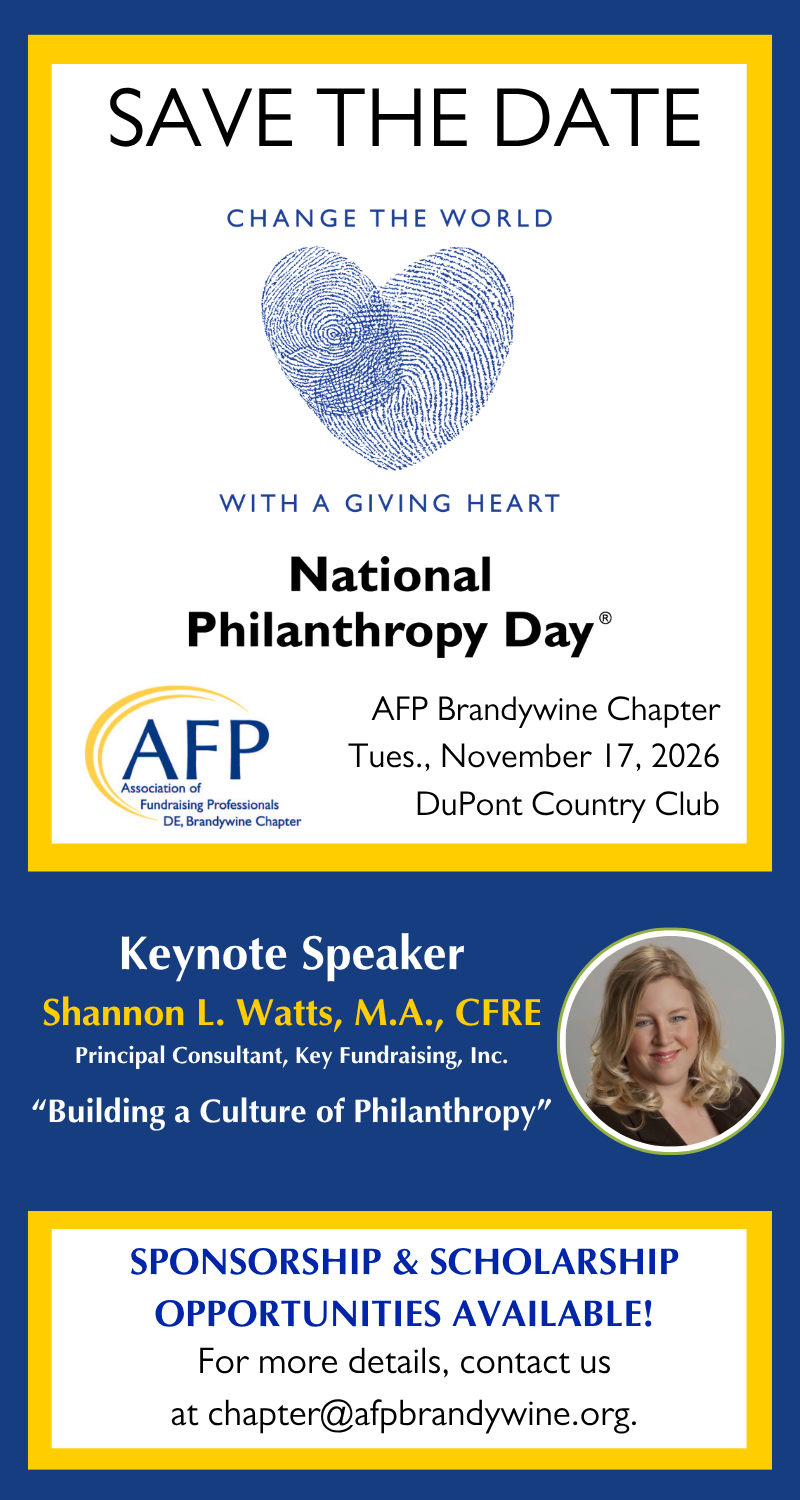 Your National Philanthropy Day sponsorship will provide recognition for your company in the community as a lead partner in our work and make a significant impact in providing a full-day of educational opportunities. To learn more about sponsorship opportunities, please contact us at chapter@afpbrandywine.org.