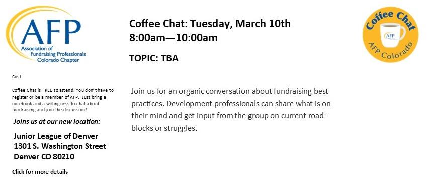 AFP Colorado Chapter is a membership organization committed to advancing philanthropy. We offer resources and create opportunities to help fundraising professionals be the best they can be. We bring fundraisers together to network, grow professionally, and advance our field.We provide educational luncheons, Rocky Mountain Philanthropy Institute (an annual fundraising conference), coffee chat, networking happy hours, and National Philanthropy Day in Colorado. We also offer opportunities for volunteering, sponsoring special events, and much more. Help make AFP CO work for you! Contact us at info@afpcc.org to learn more and get involved!Please check out our programs and volunteer opportunities and get to know your Chapter leaders. If you're not a member, join today and be connected!