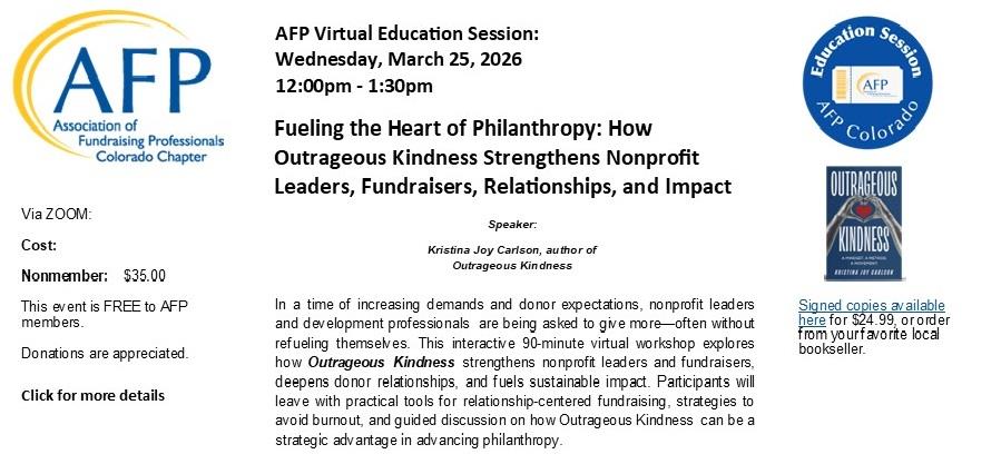 In a time of increasing demands and donor expectations, nonprofit leaders and development professionals are being asked to give more—often without refueling themselves. This interactive 90-minute virtual workshop explores how Outrageous Kindness strengthens nonprofit leaders and fundraisers, deepens donor relationships, and fuels sustainable impact. Participants will leave with practical tools for relationship-centered fundraising, strategies to avoid burnout, and guided discussion on how Outrageous Kindness can be a strategic advantage in advancing philanthropy.