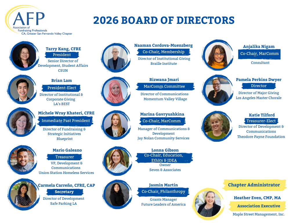 Welcome and thank you for visiting the Association of Fundraising Professionals – Greater San Fernando Valley Chapter website. You’ve come to the right place where you can develop your knowledge, skills and resources in the fundraising profession.