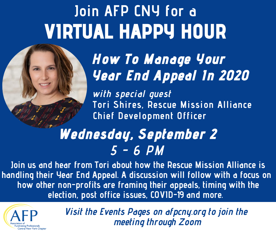 Online Instructions: Url: http://us02web.zoom.us/j/89659497431?pwd=cEhWUDI3V3pnT1NTNzk2T2pxV21hQT09Login: Topic: AFP CNY - Virtual Happy Hour with special guest Tori Shires, Chief Development Officer at the Rescue Mission Alliance