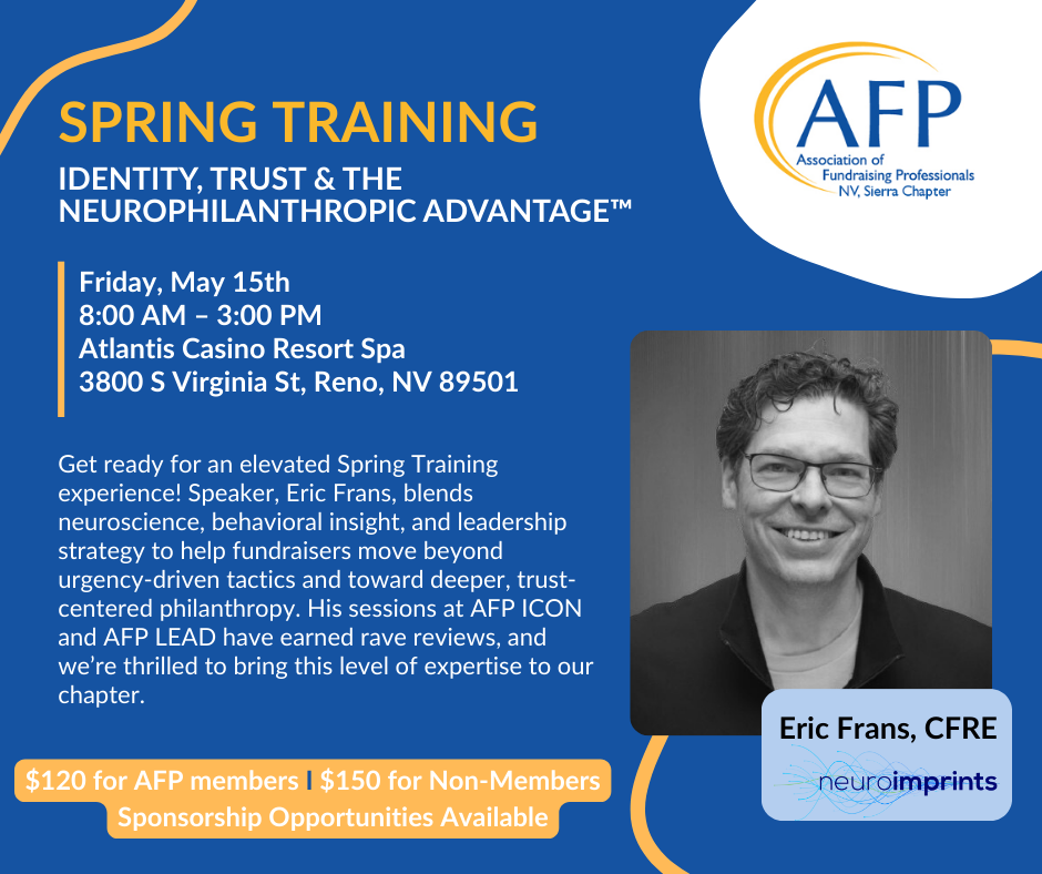 AFP Sierra Chapter is thrilled to welcome Eric Frans, CFRE, a North American-wide sought after fundraising strategist known for his work in Neurophilanthropy- and a featured speaker at AFP ICON and AFP LEAD, two of the biggest fundraising conferences in the world.