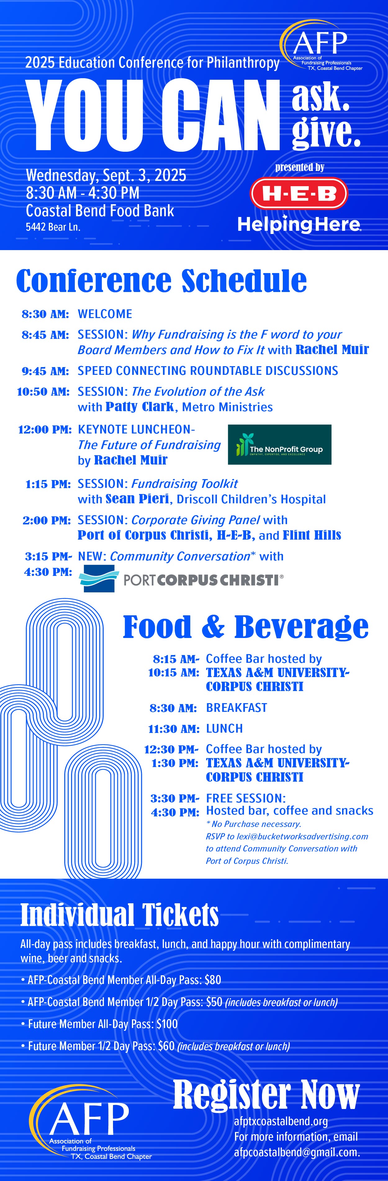 This year's conference returns to the Coastal Bend Food Bank on Wednesday, September 3rd at from 8:30am-4:30pm. Attendees have the option to enjoy a full day or half-day of speakers, roundtable discussions, and meaningful conversations. An All-Day Pass includes light breakfast, lunch, and happy hour with complimentary beer, wine, and snacks. Those who purchase a half-day pass will have the option of the morning (with a light breakfast) from 8:30am-11:45am or afternoon (with lunch) from 12pm-4:30pm.