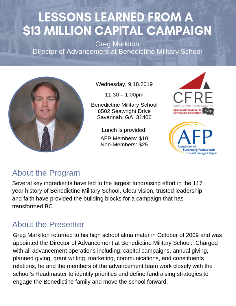 Lessons Learned from a $13 Million Capital Campaignby Greg Markiton, Director of Development, Benedictine Military SchoolAbout The ProgramSeveral key ingredients have led to the largest fundraising effort in the 117 year history of Benedictine Military School. Clear vision, trusted leadership, and faith have provided the building blocks for a campaign that has transformed BC.About The PresenterGreg Markiton returned to his high school alma mater in October of 2009 and was appointed the Director of Advancement at Benedictine Military School. Charged with all advancement operations including: capital campaigns, annual giving, planned giving, grant writing, marketing, communications, and constituents relations, he and the members of the advancement team work closely with the school’s Headmaster to identify priorities and define fundraising strategies to engage the Benedictine family and move the school forward.